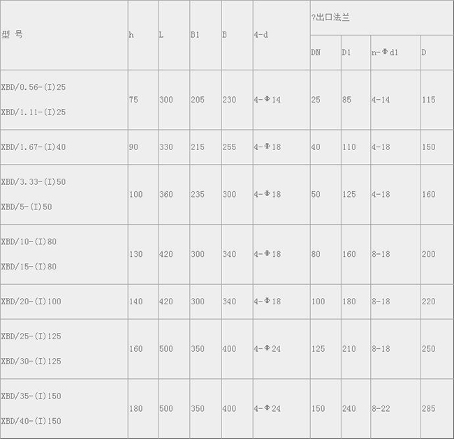 XBD-(I)型管道式消防泵是本司在原有立式多級(jí)管道泵基礎(chǔ)上根據(jù)消防泵的最新標(biāo)準(zhǔn)要求而開(kāi)發(fā)出的新一代XBD管道型中低壓消防泵組產(chǎn)品。供輸送不含固體顆粒的清水及物理化學(xué)性質(zhì)類(lèi)似于水的液體之用。適用于各種場(chǎng)合如住宅、賓館、辦公大樓、商業(yè)大樓、工廠(chǎng)、醫(yī)院等處的消防供水。