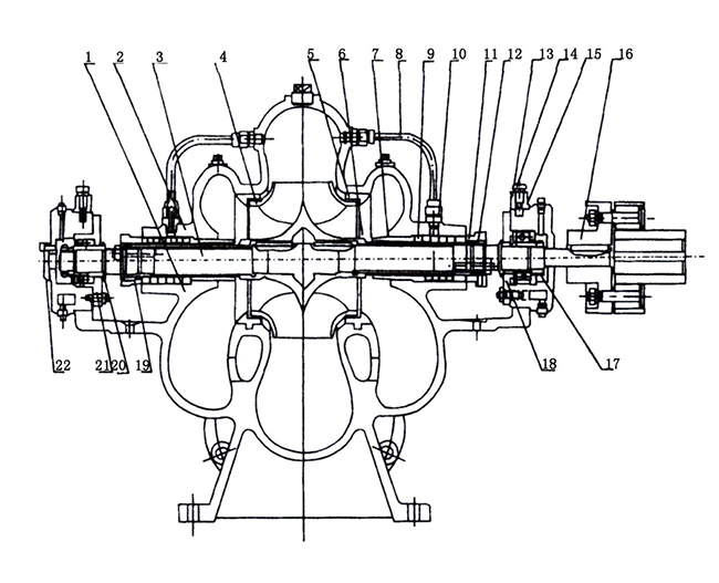 S型中開泵的吸入口和吐出口均在水泵的軸心線下方,與軸線垂直成水平方向。維修方便,無須拆卸進、出水管路及電動機,高效節能、應用范圍廣。